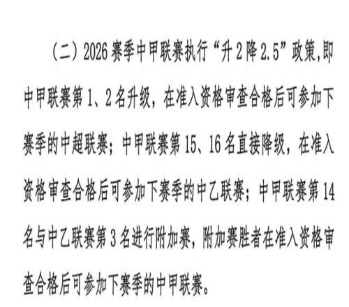 中甲聯賽3月14日開賽,新賽季升級政策不變,還是前兩名獲得中超資格。降級政策發生變化,中甲聯賽后兩名直接降級,第14名將與中乙聯賽第3名進行附加賽,競爭更為激烈。中乙聯賽3月21日開賽,新賽季后4名球隊直接降級,這一政策沒有變化。升級層面,中乙前兩名獲得中甲資格,第三名獲得沖甲附加賽資格,這對中乙參賽隊來說是個好消息。