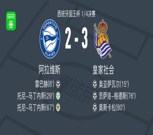 北京時間2月5日西班牙國王杯 1/4決賽,阿拉維斯對陣皇家社會。阿拉維斯雷巴赫破門,托尼-馬丁內斯破門。皇家社會奧亞薩瓦爾破門,貢薩洛-格德斯破門,奧斯卡松破門。最終比分阿拉維斯 2-3 皇家社會。