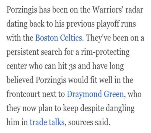 勇士隊記表示在波爾津吉斯為凱爾特人打季后賽時,勇士就盯上了他。勇士一直在尋找能護筐能遠投的中鋒,他們始終認為,波爾津吉斯非常適合與追夢格林搭檔內線,盡管此前曾把追夢放進交易籌碼,但現在勇士計劃留下這位功勛球員。