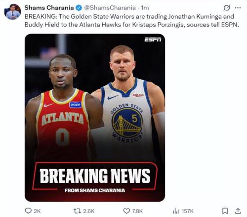 北京時間2月5日,根據ESPN記者Shams的報道,勇士、老鷹達成一筆交易,勇士用巴迪-希爾德、喬納森-庫明加換取了克里斯塔-波爾津吉斯。
