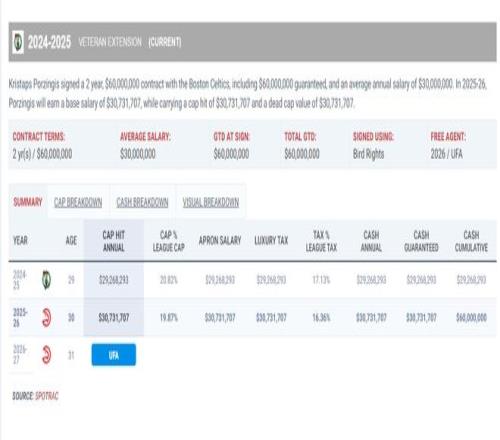 這筆交易預示著勇士隊或許已經放眼休賽期了,因為波爾津吉斯25-26賽季3073萬是到期合同。他本賽季只為老鷹打14場比賽,場均24.1分鐘,拿到16.9分4.6籃板2.9助攻0.64搶斷1.21蓋帽,命中率46.7%,三分命中率36.7%。