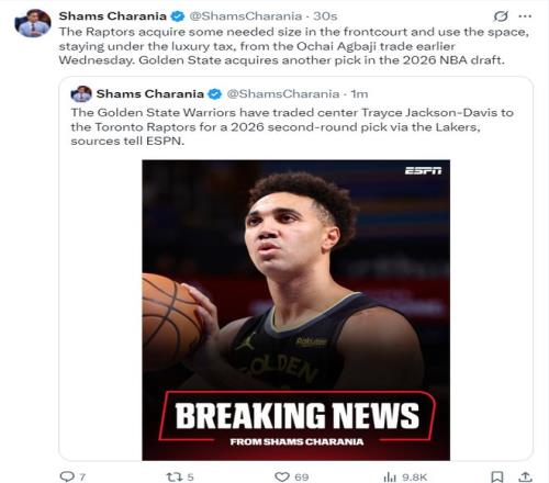 很快Shams接著報道,勇士隊將杰克遜-戴維斯交易到猛龍隊,換來一個2026年的次輪簽。這個次輪簽是勇士隊從湖人處得到的2026年次輪簽。猛龍隊通過阿巴基的交易已經避免了奢侈稅,得到TDJ后也獲得了更大的尺寸優勢。