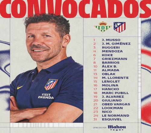 前鋒:7-格列茲曼、10-巴埃納、11-阿爾馬達、19-阿爾瓦雷斯、20-朱利亞諾-希門尼斯、22-盧克曼、23-尼古拉斯-岡薩雷斯