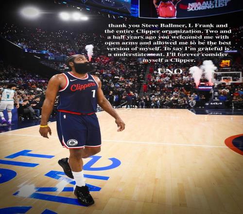 哈登在社媒中寫道:“感謝鮑爾默、弗蘭克以及整個快船上下的所有組織人員。兩年半之前,你們張開雙臂歡迎我,讓我得以成為最好的自己。對此,我說感激涕零都不足以表達我的心意,我將永遠視自己為快船的一份子。”