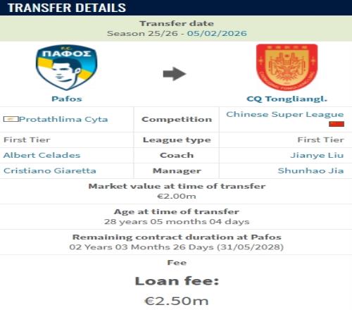 體育播報02月06日宣 重慶銅梁龍官方宣布,帕福斯邊鋒迪馬塔租借加盟球隊,租期一年。