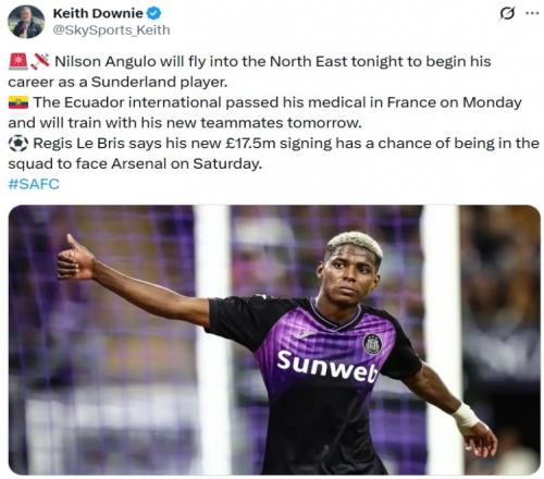 報道稱這位厄瓜多爾國腳周一在法國通過了體檢,并將于明天與新隊友一起訓練。主教練雷吉斯·勒布里斯表示,這位球隊1750萬英鎊引進的新援有可能在周六對陣阿森納的比賽中進入大名單。