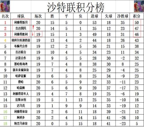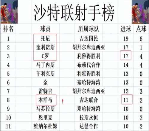 積分榜方面,難怪C羅要郁悶,本澤馬一來就造4球,利雅得新月狂勝,他們暫時又將和利雅得勝利的差距拉大到4分。吉達國民先賽贏球后,1分優勢將利雅得勝利擠到第3的位置。