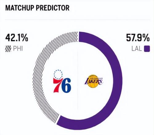 賽前,美媒ESPN對本場比賽進行了勝率預測,湖人隊勝率高達57.9% ,76人勝率則僅有42.1% ,劣勢明顯。