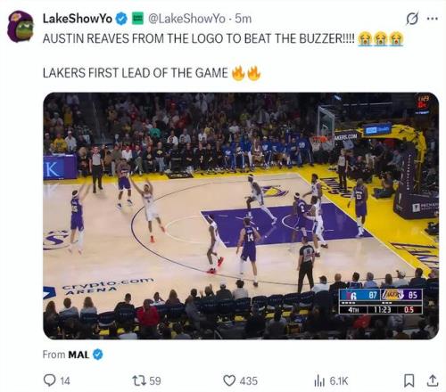 第三節(jié)剛開(kāi)場(chǎng),里夫斯還剩0.5秒接球完成了一個(gè)壓哨的超遠(yuǎn)三分,這是一個(gè)不沉球的超遠(yuǎn)三分,湖人媒體都看哭了。