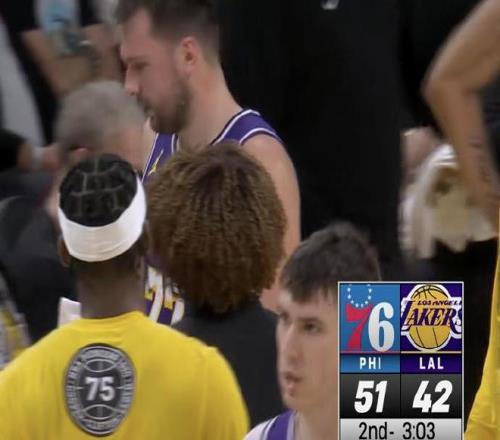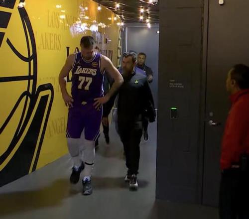 在比賽進行到第二節時刻,東契奇在一次進攻回合后,他出現受傷情況捂著左腿,湖人請求暫停,隨后東契奇被替換下場,也是很快返回更衣室去接受檢查。