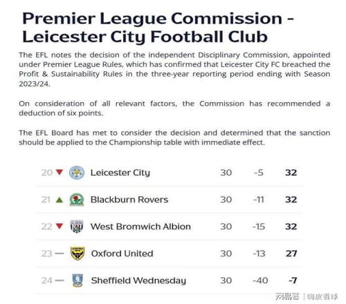 英格蘭足球聯賽(EFL)剛剛發布消息,表示注意到獨立紀律委員會的決定,這是根據英超聯賽規則而任命的,確認了萊斯特城因為在過去三個賽季里,違反了盈利和可持續(PSR)的規則。因此,立刻扣除萊斯特城6個積分,并且從實時的積分榜中反映出來。