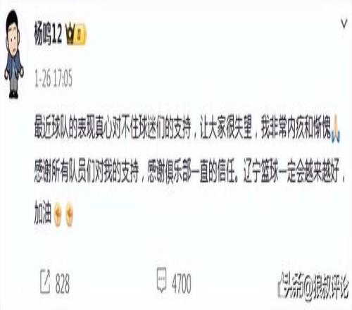 1月26日,遼寧男籃官方社媒發(fā)文,楊鳴正式卸任遼籃主帥的位置,對(duì)此,楊鳴表示:最近球隊(duì)的表現(xiàn)真心對(duì)不住球迷們的支持,讓大家很失望,我非常內(nèi)疚和慚愧。
