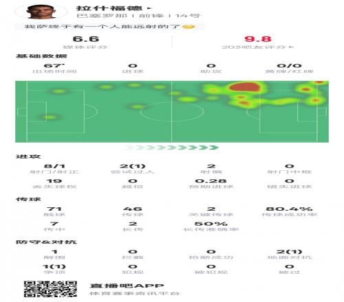 體育播報(bào)2月8日宣 西甲第23輪,巴薩對(duì)陣馬洛卡,拉什福德首發(fā)出戰(zhàn),8次射門1次射正,送出2次關(guān)鍵傳球,1次過(guò)人成功,但也有19次丟失球權(quán),評(píng)分6.6。