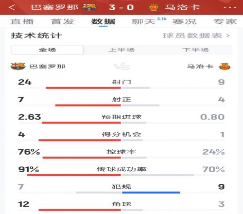巴薩30馬洛卡全場(chǎng)數(shù)據(jù):射門(mén)249,射正74,得分機(jī)會(huì)41