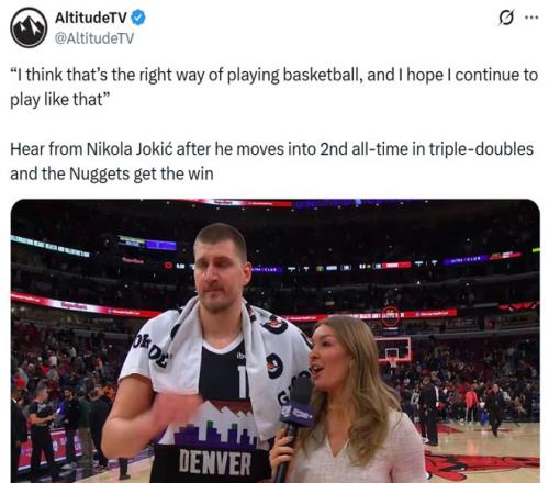 賽后談到自己的三雙數(shù)時,約基奇也坦言:“我認為這就是正確的籃球打法,希望能夠繼續(xù)這樣打下去。”