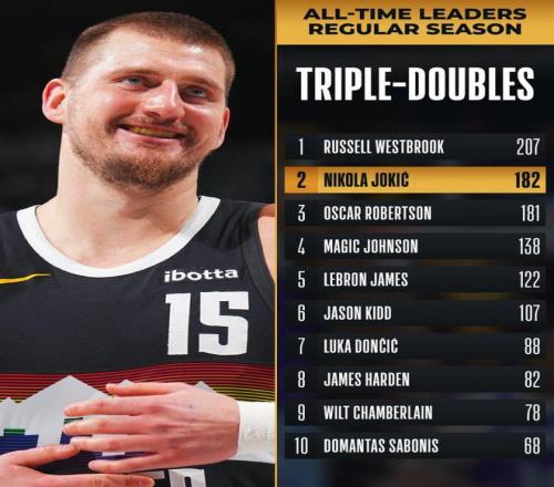 同時反超第一威少也進入倒計時,目前他還落后25次,但約基奇拿到182場三雙僅花費782場比賽,而威少拿到207次三雙則用了1288場,相差506場之多。