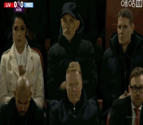 第34分鐘,鏡頭給到現(xiàn)場觀戰(zhàn)的圖赫爾和羅納德-科曼
