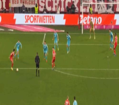 第62分鐘,基米希長傳右路,奧利塞下底倒三角回敲,路易斯-迪亞斯門前包抄推射入網,拜仁繼續擴大戰果,4-1!