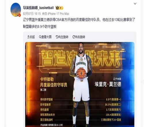 2月7日,CBA官方發(fā)布正式官宣,遼寧男籃的內(nèi)線球員莫蘭德,當選為2025-2026賽季CBA聯(lián)賽第二期月度最佳防守球員。不得不說,我們理應向莫蘭德表示祝賀。莫蘭德身高兩米零八,在內(nèi)線領(lǐng)域,他的防守意識和防守能力都堪稱CBA聯(lián)盟頂級水準,而且本賽季他始終保持穩(wěn)定高效的發(fā)揮,用實力為球隊保駕護航。