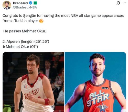 紀錄一:這是申京生涯第二次入選全明星,成功超過同胞奧庫成為入選全明星次數(shù)最多的土耳其球員。