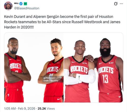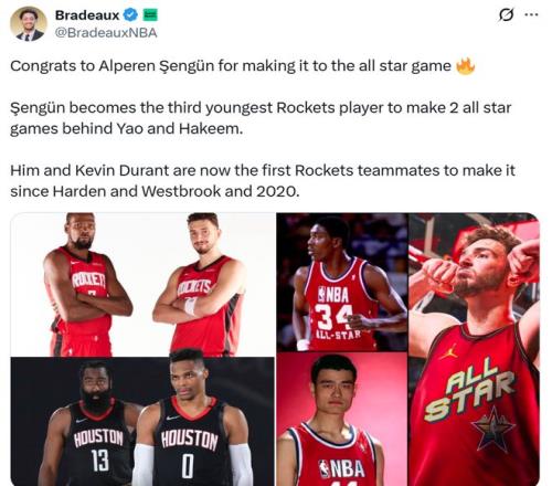 紀錄四:加上此前杜蘭特已經(jīng)入選,讓杜蘭特與申京成為火箭隊史自2020年哈登和威少以來首次同時入選全明星的隊友。
