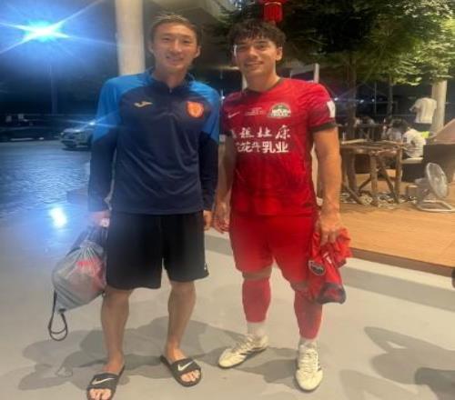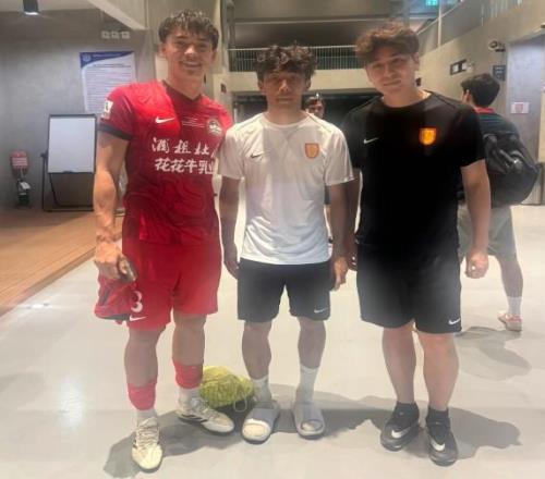 河南隊后衛周緣德曬與重慶銅梁龍后衛晉鵬翔、和曉強合照,三人曾在2024賽季幫助大連英博沖超。