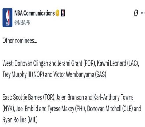 西部:克林根和格蘭特(開(kāi)拓者)、萊昂納德(快船)、墨菲(鵜鶘)、文班亞馬(馬刺)