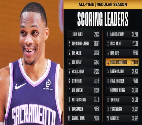 37歲的威少在NBA已經打了18個賽季,他終于拿到了27000分,也是NBA歷史上第14位達成2.7萬分的球員。