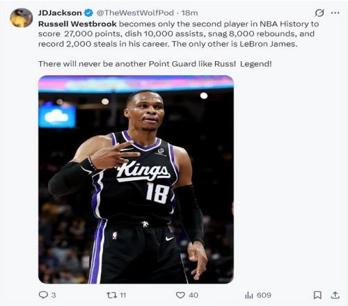根據美記JD-杰克遜的報道,威少成為NBA歷史上唯二能達成:27000分+10000助攻+8000籃板+2000搶斷的球員,另一位是勒布朗-詹姆斯,NBA歷史上再也不會出現這樣的控球后衛,他是傳奇巨星。
