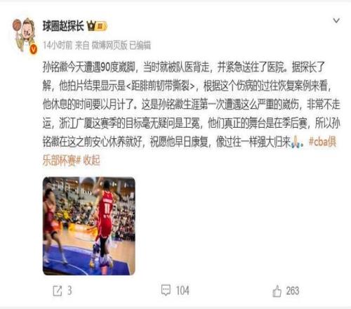 根據媒體人“球圈趙探長”的消息,孫銘徽的拍片結果顯示是距腓前韌帶撕裂,根據這個傷病的過往恢復案例來看,他的休息時間要以月計了。孫銘徽職業生涯第一次遭遇這么嚴重的崴傷,非常的不幸,浙江廣廈隊本賽季的目標是衛冕,他們的舞臺在季后賽和總決賽,希望屆時孫銘徽可以復出幫助球隊在季后賽走得更遠吧。