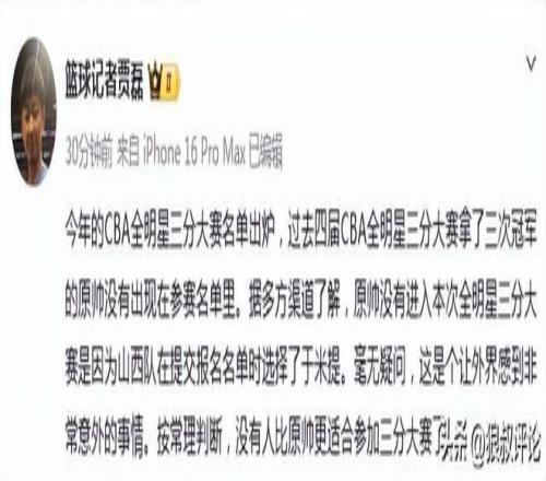 打聽了一下,聽說是山西隊(duì)主動(dòng)報(bào)名于米提頂替了他,于米提本賽季投的確實(shí)不錯(cuò),但聯(lián)賽中的三分命中率和場均貢獻(xiàn)數(shù)據(jù)還沒有趕上原帥,這樣一來,等于是“剝奪了”原帥創(chuàng)造全明星歷史的機(jī)會(huì),這個(gè)操作,確實(shí)很詭異。