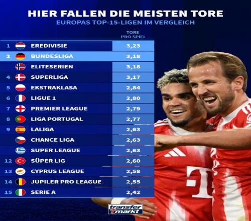 體育播報2月11日宣 德國轉會市場盤點了本賽季歐洲前15大聯賽場均進球數,荷甲以3.23球居首,德甲3.18球位居次席。