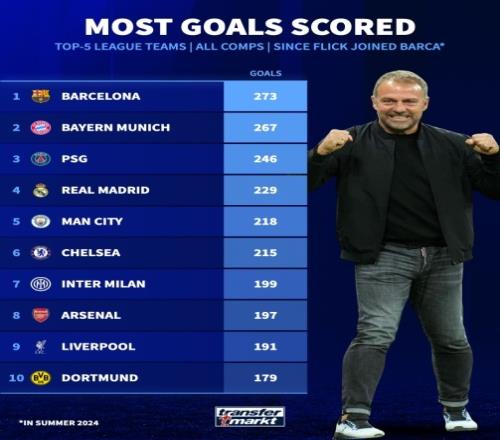 弗里克接手后各項賽事進球榜:巴薩273球拜仁、巴黎、皇馬列前四