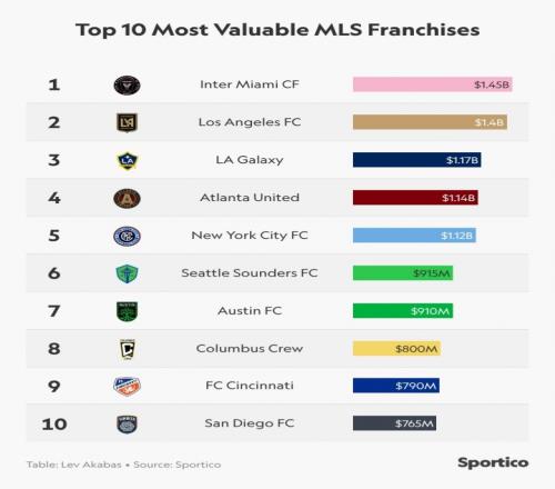 邁阿密國際的估值增長22%,以14.5億美元排名美職聯(lián)第一,領(lǐng)先第二名洛杉磯FC的14億美元,30支美職聯(lián)球隊的總估值達(dá)到230億美元。