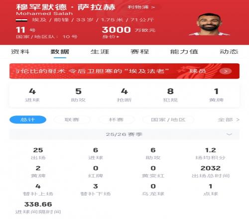 薩拉赫現年33歲,他本賽季為利物浦出場25次,貢獻6球6助,他現身價3000萬歐,周薪40萬鎊,他與利物浦的合同明夏到期。