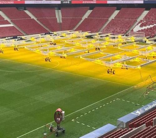目前距離馬競(jìng)對(duì)陣巴薩的首回合比賽僅剩48小時(shí)左右,球場(chǎng)內(nèi)近一半?yún)^(qū)域覆蓋著生長(zhǎng)燈——這類模擬陽(yáng)光的燈具常被用于高水平草坪的維護(hù)。2024年起,大都會(huì)球場(chǎng)開(kāi)始使用Hatko Hybridgrass,這是一種新一代混合草皮,由西班牙公司Royalverd負(fù)責(zé)安裝并提供技術(shù)支持。