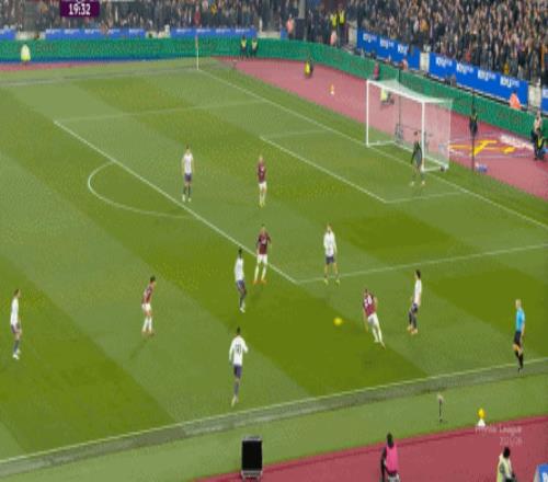 而這種身體層面帶來的問題,不僅會出現在有球的時候,也會出現在無球的時候,比如這次高位逼搶,實際上只有布魯諾一人有效參與,于是西漢姆聯后衛可以先抬頭觀察,再低頭起腳,便和鮑文一起制造了前場的定位球: