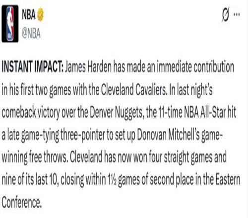 NBA官方也對哈登加盟騎士后的作用給予很高的評價。NBA官方賬號寫道:“即時效應: 詹姆斯-哈登在加盟克利夫蘭騎士的前兩場比賽就立刻做出了貢獻。在昨晚逆轉擊敗丹佛掘金的比賽中,這位11屆NBA全明星命中了一記關鍵的扳平三分,為米切爾的絕殺罰球奠定了基礎、騎士目前已經取得四連勝,近10場比賽贏下9場,與東部第二的差距僅剩1.5個勝場。”