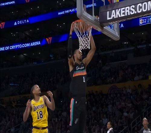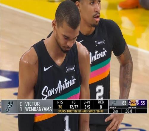 這場球一開場,文班亞馬就給比賽奠定了基調(diào),他里突外投,造犯規(guī),補(bǔ)籃,扣籃,什么都有,湖人根本沒法防守。首節(jié)打了8分鐘,8投7中,狂砍25分,太恐怖了。單節(jié)25分,是他個人單節(jié)紀(jì)錄。第二節(jié)比賽,文班亞馬中段才登場,但他登場后,并沒有首節(jié)那種攻擊欲望,但是他強(qiáng)大的強(qiáng)制力,以及全方位的火力覆蓋,還是讓湖人防不勝防,第二節(jié)文班亞馬砍下12分,上半場就砍下37分!