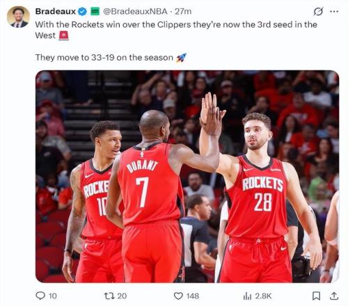 此役后火箭拿到33勝19負(fù)升至西部第三(掘金34勝20負(fù)掉到西部第四),火箭隊在不知不覺重返西部前三,他們距離西部第二的馬刺還有3個勝場差。
