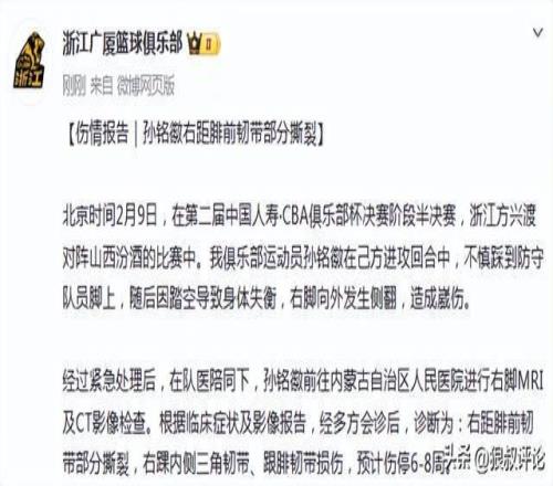 北京時間2月11日,根據(jù)廣廈男籃官方社媒公示,孫銘徽右距腓前韌帶部分撕裂,預(yù)計將會傷停6-8周。