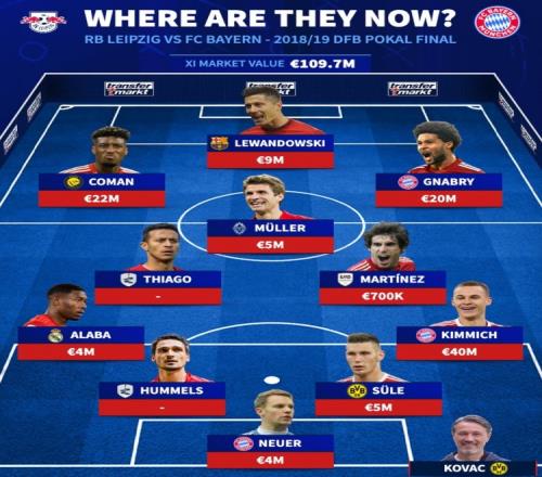 拜仁7年前德國(guó)杯對(duì)萊比錫首發(fā)及如今身價(jià):總身價(jià)1.097億歐元