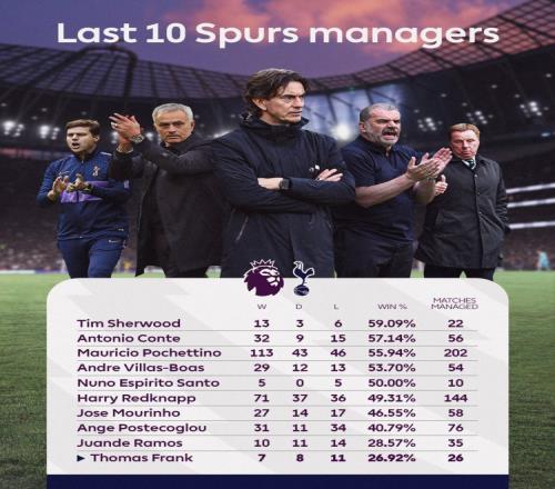 英超官方將熱刺最近十任主帥的聯賽帶隊成績進行了對比,托馬斯·弗蘭克勝率26.92%墊底。