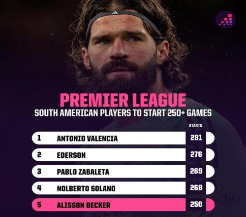 英超第26輪,利物浦客場對陣桑德蘭,利物浦門將阿利松迎來英超生涯第250次出場,成為第五位達成這一里程碑的南美球員。