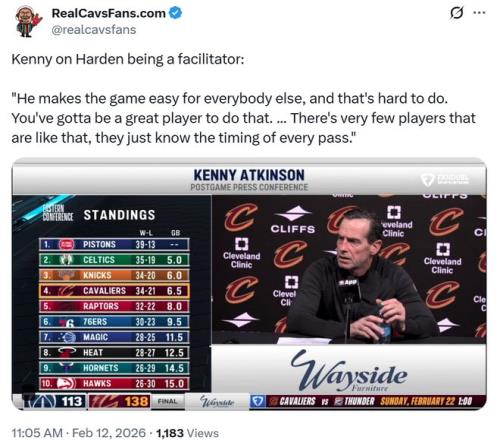 正如賽后騎士主帥阿特金森所說:“哈登讓身邊的每個人都打得更輕松,他給艾倫每一次傳球的時機把握都非常精準,就連分球到外線的選擇也恰到好處,你得是頂尖球員才能做到這一點,聯盟里沒幾個人真正能做到。”