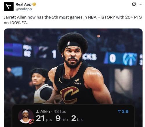 本場艾倫8中8,百分百命中率轟下21分9板1助2蓋帽,正負值+25全場最高,這是艾倫生涯第4次以100%命中率轟下20+,成功升至NBA歷史第5,僅次于貝爾(10次)、張伯倫(9次)、霍華德(7次)和吉爾摩爾(6次)。