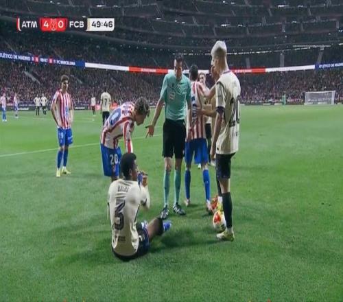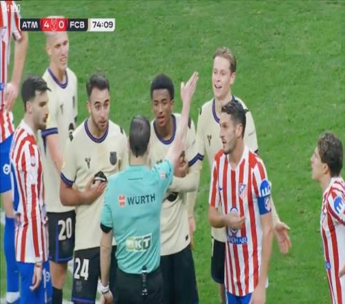 馬競?cè)€回防,西蒙尼換上了更多的防守球員,令巴薩的推進更加困難。第85分鐘,埃里克加西亞直接被紅牌罰下,隨即產(chǎn)生的各種爭議,引發(fā)了一系列的沖突,裁判連續(xù)出示多張黃牌平息。