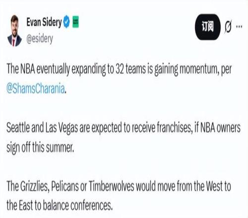 北京時間2月13日,據(jù)名記Shams報道,NBA最終擴軍至32支球隊的趨勢正在增強。如果NBA老板們今年夏天批準,西雅圖和拉斯維加斯有望獲得特許經(jīng)營權。為了平衡東西部實力,灰熊、鵜鶘和森林狼中的一隊將從西部遷至東部。