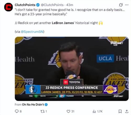 雷迪克賽后談到詹姆斯:我從來沒有把勒布朗的表現當成理所當然,但我每天都有切實的感受,他仍處于職業生涯的巔峰期,他已經在巔峰23年之久了。
