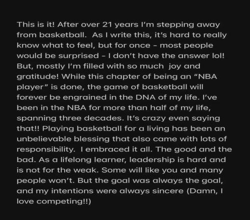 緊接著保羅在個人社媒宣布正式退役,結束自己長達21年的NBA球員生涯。
